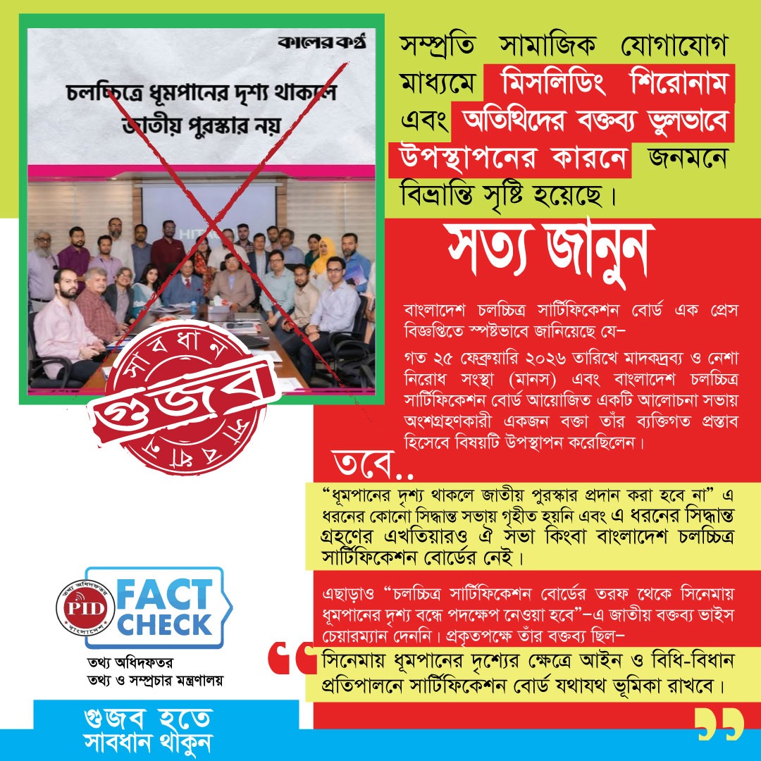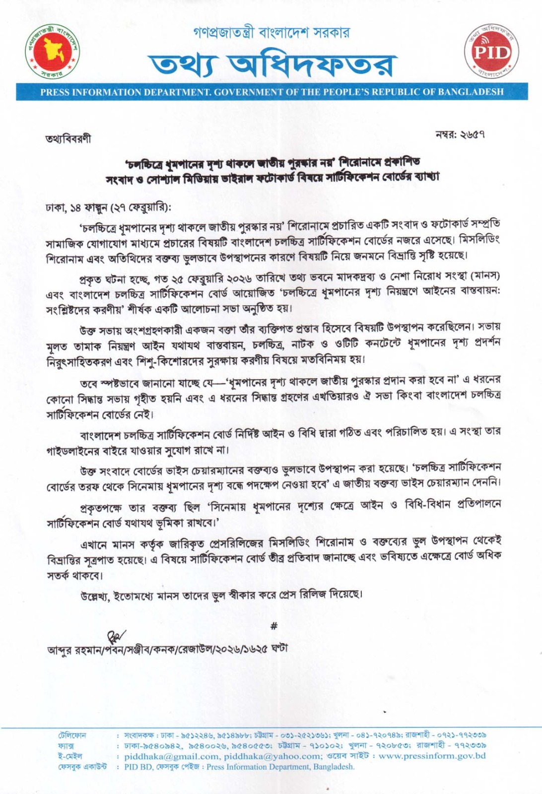 ‘চলচ্চিত্রে ধূমপানের দৃশ্য থাকলে জাতীয় পুরস্কার নয়’ শিরোনামে প্রকাশিত সংবাদ ও সোশ্যাল মিডিয়ায় ভাইরাল ফটোকাড বিষয়ে সার্টিফিকেশন বোর্ডের ব্যাখ্যা।